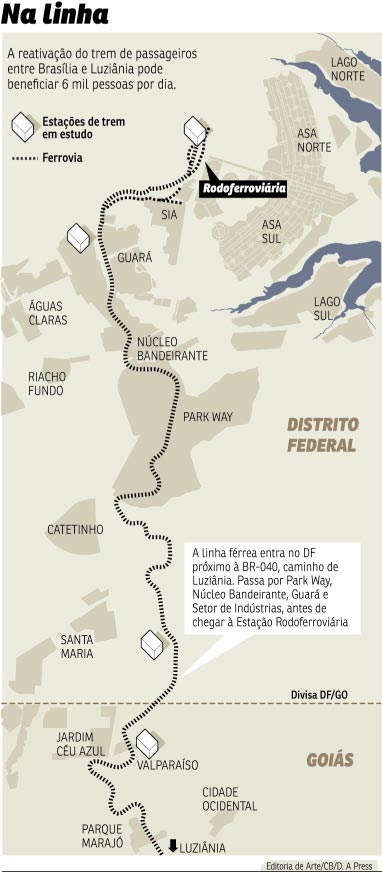 Enquanto aguarda, por cerca de uma hora, o ônibus para Brasília, a empregada doméstica Elizângela Zacarias dos Santos, 36 anos, conversa com outros moradores de Luziânia (GO) sobre a ativação do trem de passageiros. A solução para o transporte público entre o Entorno Sul do DF e a capital está a menos de 100 metros, materializada em uma linha ferroviária que, há 22 anos, transporta apenas carga. O assunto é recorrente entre os habitantes da região, desde que a Superintendência do Desenvolvimento do Centro-Oeste (Sudeco) assinou contrato com as empresas vencedoras do consórcio que farão os estudos de viabilidade técnica, econômica e ambiental para a criação do sistema. O acordo ocorreu em 19 de dezembro.