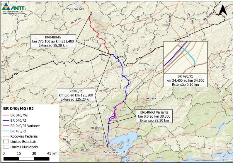 - Rodovia BR-040/RJ, trecho com início na divisa Minas Gerais/Rio de Janeiro, até o entroncamento com a BR-116/RJ (p/ Trevo das Missões), no Estado do Rio de Janeiro;