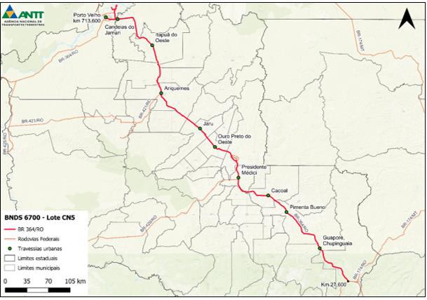 - BR – 364/RO (Contorno Ji Paraná), trecho compreendido entre o entroncamento com a BR364 (Início Anel Viário Ji-Paraná) até o entroncamento BR-364 (Fim Anel Viário Ji-Paraná);