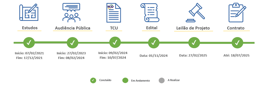 Na sequência, o Plano de Outorga foi aprovado pelo Ministério dos Transportes, por meio da Portaria nº 144, de 9 de fevereiro de 2024, e posteriormente encaminhado ao Tribunal de Contas da União (TCU) para análise.
