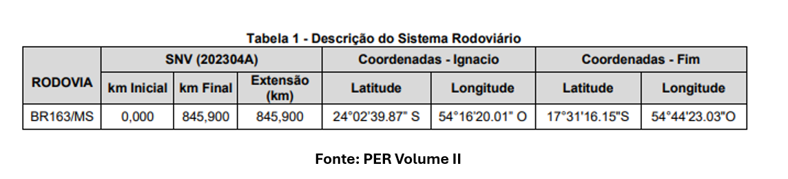 Extensão: BR 163/MS, trecho do início na divisa com o estado do Mato Grosso e término na divisa com o Estado do Paraná correspondente a 845,9 km.