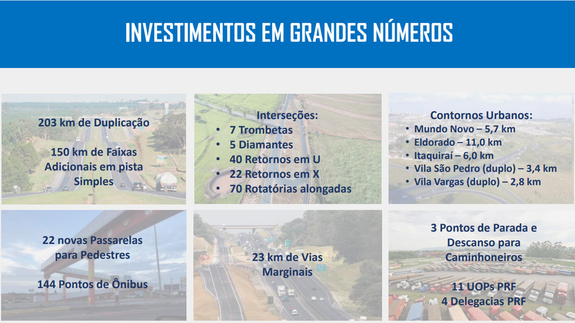 - Duplicação de 65 km de rodovia e conclusão do Contorno de Mundo Novo nos três primeiros anos da celebração do Termo Aditivo ao Contrato de Concessão;