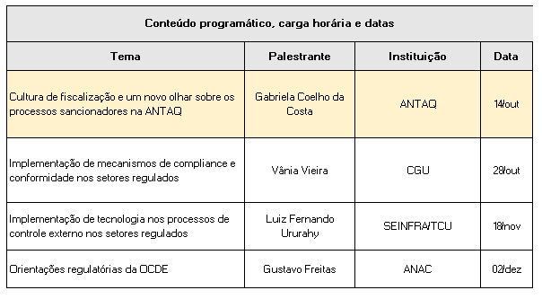 Neste mês, dia 14/10, o assunto abordado será “Cultura de fiscalização e um novo olhar sobre os processos sancionadores na Antaq”, apresentado por Gabriela Coelho da Costa, servidora do quadro efetivo e superintendente de fiscalização da Agência Nacional de Transportes Aquaviários.