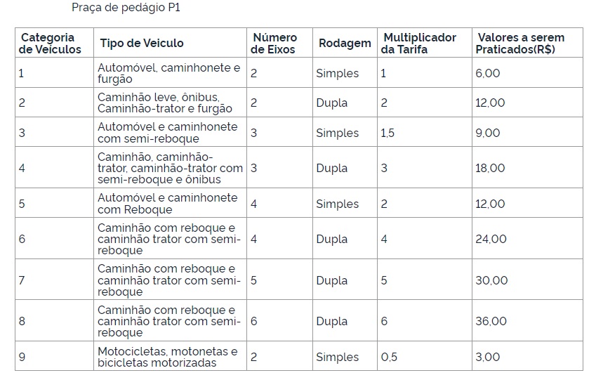 A aplicação do Índice de Reajuste Tarifário - IRT, de 1,68832, representa o percentual positivo de 12,13%, correspondente a variação do Índice Nacional de Preços ao Consumidor Amplo - IPCA no período. Dessa forma, a Tarifa Básica de Pedágio será atualizada e reajustada após arredondamento, para a categoria de veículo 1, de R$ 4,90 para R$ 6,00, conforme tabela abaixo.
