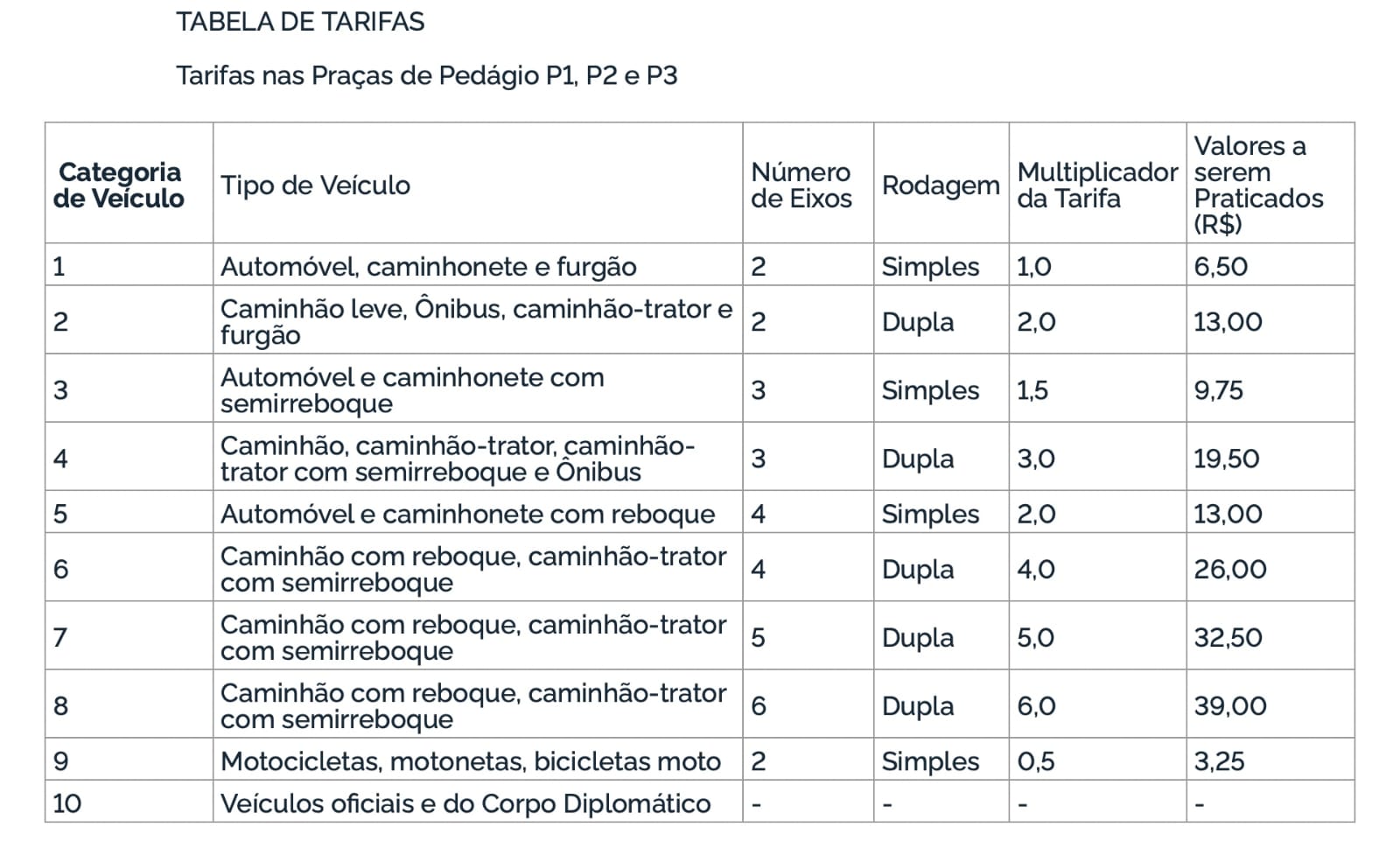 A deliberação, portanto, altera a Tarifa Básica de Pedágio, após arredondamento, para categoria 1 de veículos, de R$ 6,10 para R$ 6,50, nas praças de pedágio P1, em Sapucaia/RJ, P2, em Paraíba do Sul/RJ, e P3, em Barra do Piraí/RJ, como informa tabela abaixo.