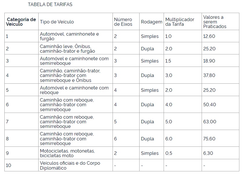 Reajuste: tem por intuito a correção monetária dos valores da tarifa e leva em consideração a variação do Índice de Preços ao Consumidor Amplo (IPCA). Acontece uma vez ao ano, sempre no aniversário do início da cobrança de pedágio.