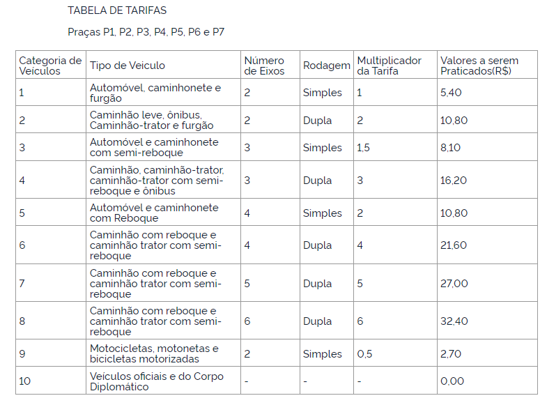 A publicação reajusta a tarifa básica de pedágio para a categoria de veículo 1 de R$ 5,20 para R$ 5,40. Confira abaixo a tabela com as tarifas para todas as categorias de veículos.