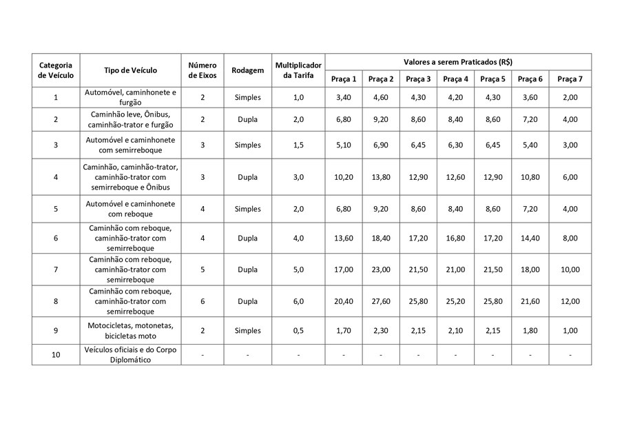 Veja abaixo a tabela com a alteração das tarifas de pedágio: