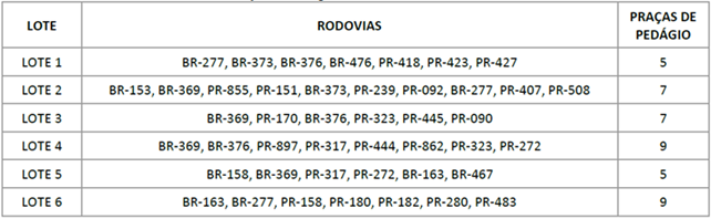 As praças de pedágio globais dos seis lotes totalizam 42, conforme tabela abaixo: