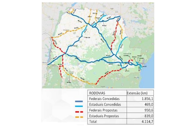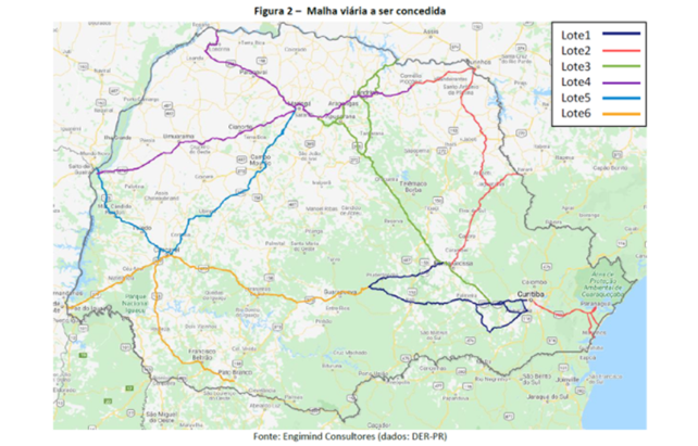 O projeto de concessão a ser debatido consiste na exploração por 30 anos, prorrogáveis por mais 5 anos, da infraestrutura e da prestação do serviço público de recuperação, conservação, manutenção, operação, implantação de melhorias e ampliação de capacidade do Sistema Rodoviário de seis lotes das Rodovias Integradas do Paraná (BR- 153/158/163/272/277/369/373/376/476/PR). Os lotes estão divididos da seguinte forma: