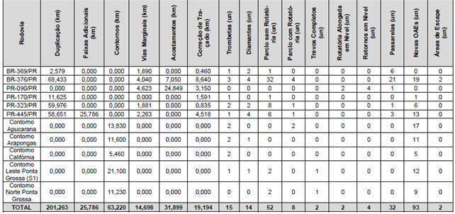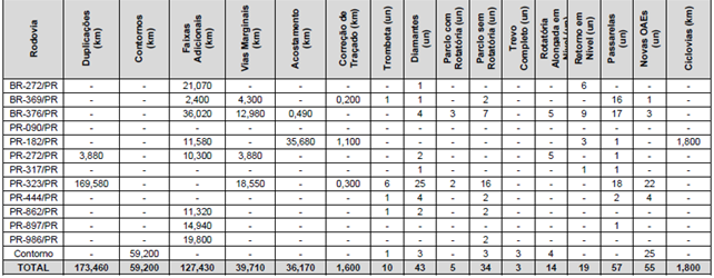 Lote 4 : trechos das rodovias BR-272, BR-369, BR-376, PR-182, PR-272, PR-317, PR-323, PR-444, PR-862, PR-897 e PR-986, numa extensão total de 627,98 km;