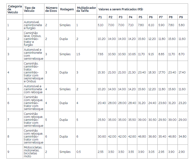 A deliberação nº 521 também aprova, a partir da data-base de reequilíbrio contratual de 14 de setembro de 2020, a Tarifa de Pedágio para categoria 1 de veículos (automóvel, caminhonete e furgão) nas praças de pedágio P1, em Mundo Novo, P2, em Itaquiraí/NAviraí, P3, em Caarapó, P4, em Rio Brilhante, P5, em Campo Grande, P6, em Bandeirantes/Rochedo/Jaguari, P7, em São Gabriel do Oeste/Camapuã, P8, em Rio Verde de Mato Grosso e P9, em Pedro Gomes/Sonora.
