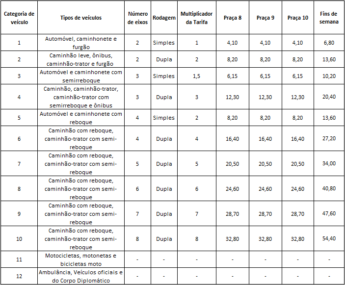 A publicação define a TBP para categoria 1 de veículos de R$ 4,10 nas praças de pedágio P8, P9 e P10, em Paraty (RJ), em Mangaratiba (RJ) e em Itaguaí (RJ). Para veículos comerciais, a tarifa é multiplicada pelo número de eixos, conforme tabela abaixo.