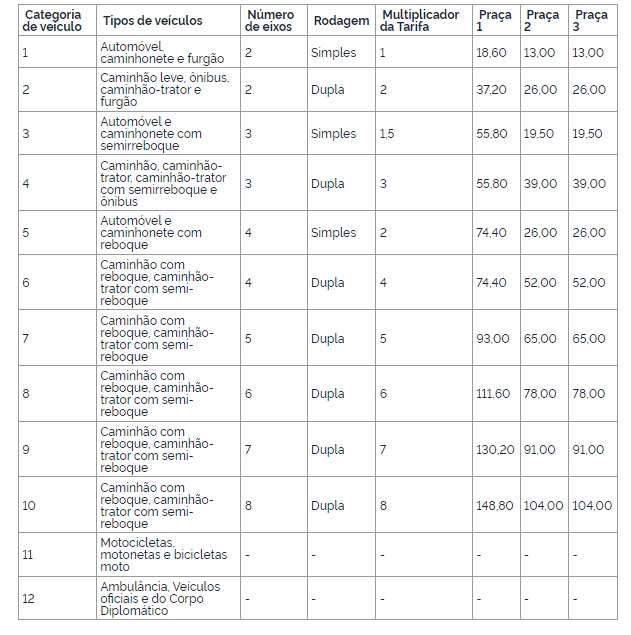 Após os reajustes e arredondamentos, a Tarifa Básica de Pedágio, como indica a tabela anexa, para categoria 1 de veículos, será de R$ 18,60 na praça de pedágio P1, em Engenheiro Pierre Berman/RJ e de R$ 13,00 na praça de pedágio P2, em Santa Guilhermina/RJ e na praça de pedágio P3, em Santo Aleixo/RJ.