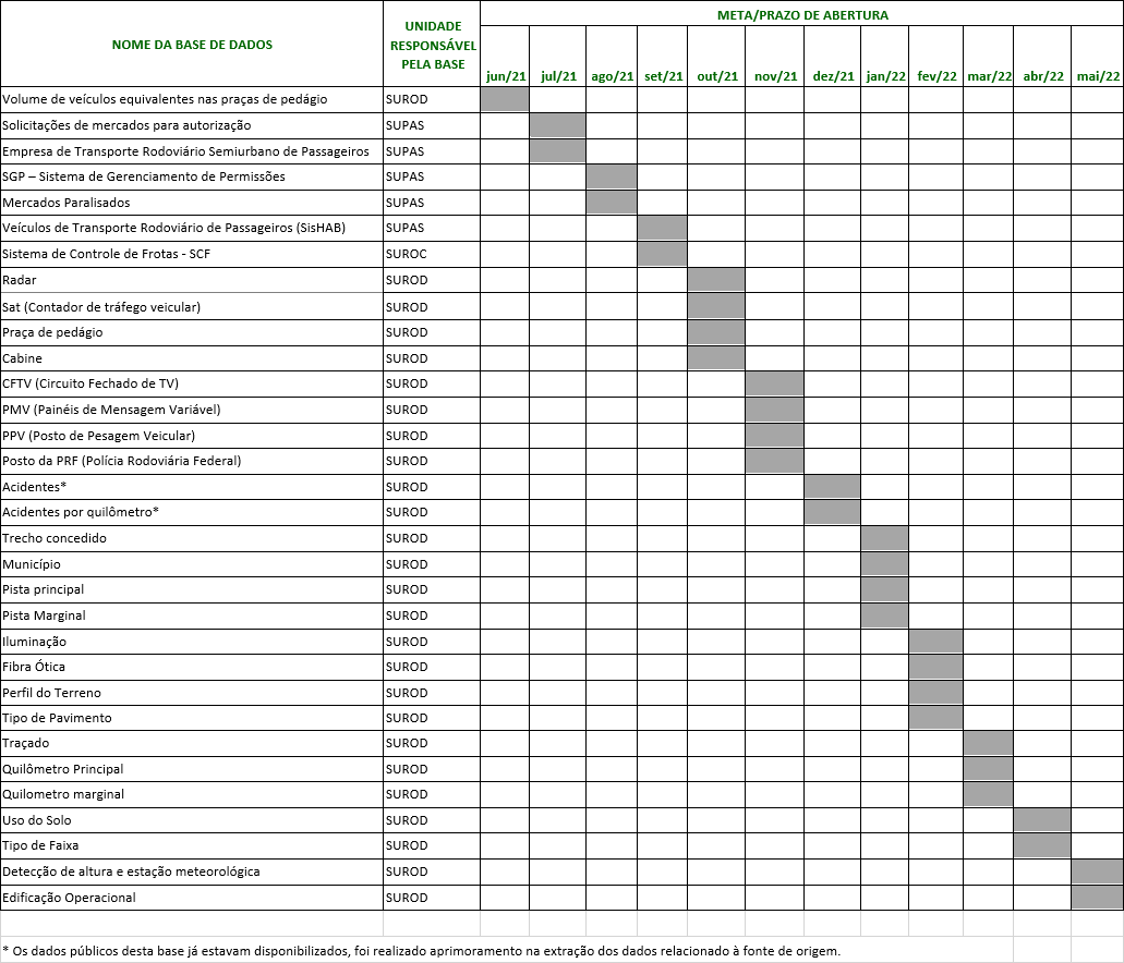 A publicação dos dados planejados para o período foi possível graças ao trabalho em equipe da Ouvidoria da Agência, da Superintendência de Tecnologia da Informação (Sutec/ANTT) e das unidades organizacionais gestoras dos dados. O cronograma da divulgação de cada base de dados pode ser conferido abaixo: