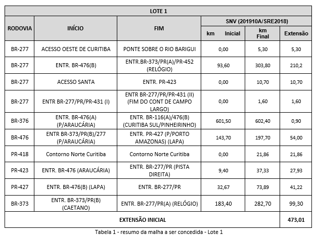 •Lote 1 – Rodovias BR-277/373/376/476 e PR-418/423/427;