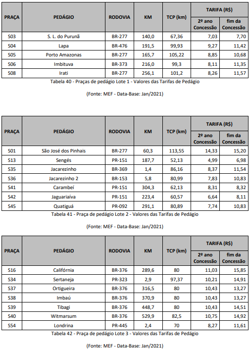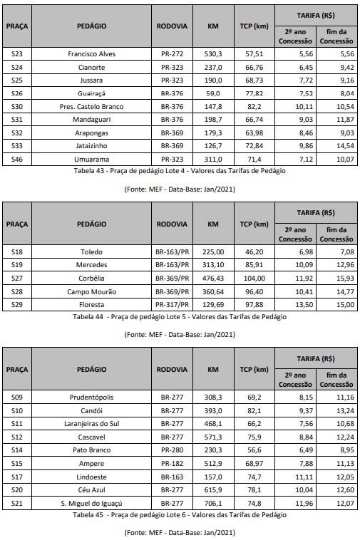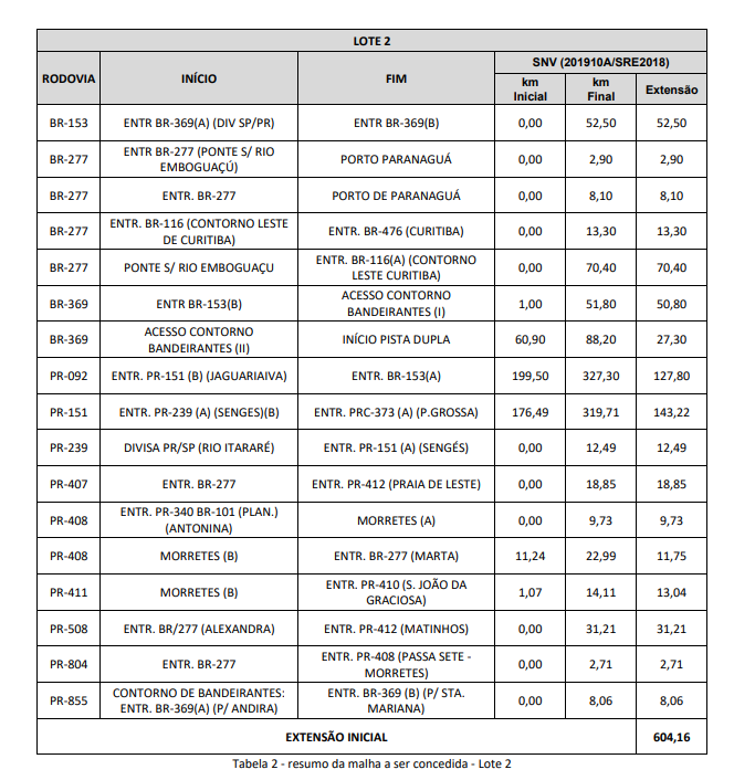 A rodovia – Após a análise de todas as contribuições da AP nº 1/2021 , a ANTT reformulou o projeto e apresentou o seu Plano de Outorga. A futura concessão consiste na exploração por 30 anos, prorrogáveis por mais 5 anos, da infraestrutura e da prestação do serviço público de recuperação, conservação, manutenção, operação, implantação de melhorias e ampliação de capacidade do Sistema Rodoviário de seis lotes das Rodovias Integradas do Paraná (que engloba trechos federais e estaduais). Serão 3.350,39 km, divididos em seis lotes: