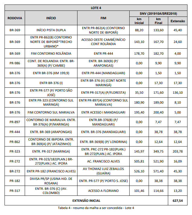 •Lote 4 – Rodovias BR-272/369/376 e PR-182/272/317/323/444/862/897/986;