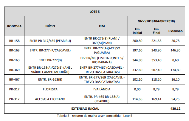 •Lote 5 – Rodovias BR-158/163/369/467 e PR-317; e