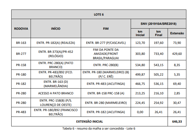 •Lote 6 – Rodovias BR-163/277 e PR-158/180/182/280/483.