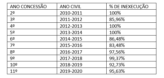 Desde o início da concessão, a ViaBahia tem apresentado um índice de inexecução contratual próximo de 100%, conforme tabela a seguir:
