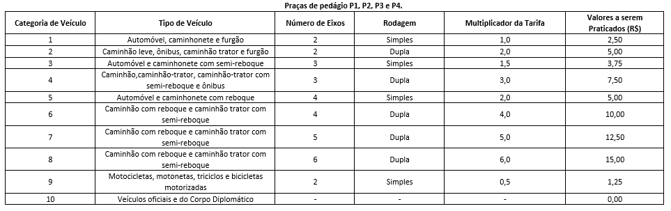 A publicação altera, após o arredondamento, a Tarifa Básica de Pedágio, para categoria de veículo 1, de R$ 2,40 para R$ 2,50, nas praças de pedágio P1 (Laguna), P2 (Tubarão), P3 (Araranguá) e P4 (São João do Sul).