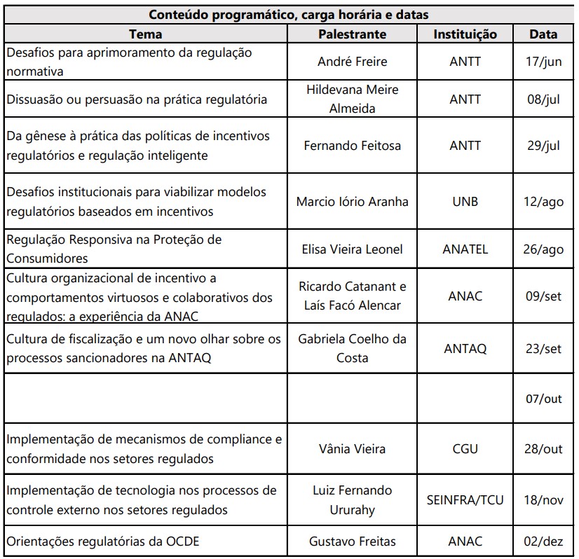 Serão 11 palestras ao todo, de junho a dezembro, em que especialistas de diversas instituições (ANTT, Anatel, Anac, Antaq, TCU, CGU e UnB) abordarão temáticas diversas que envolvem o universo da regulação. Veja o cronograma:
