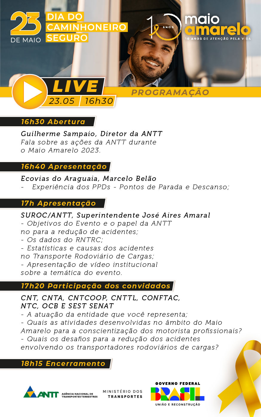 Será em formato de “live”, pelo Canal ANTT no Youtube, com início às 16h30. Esta é mais uma ação da ANTT dentro da programação do mês de conscientização pela segurança viária, como parte da campanha nacional do Maio Amarelo.
