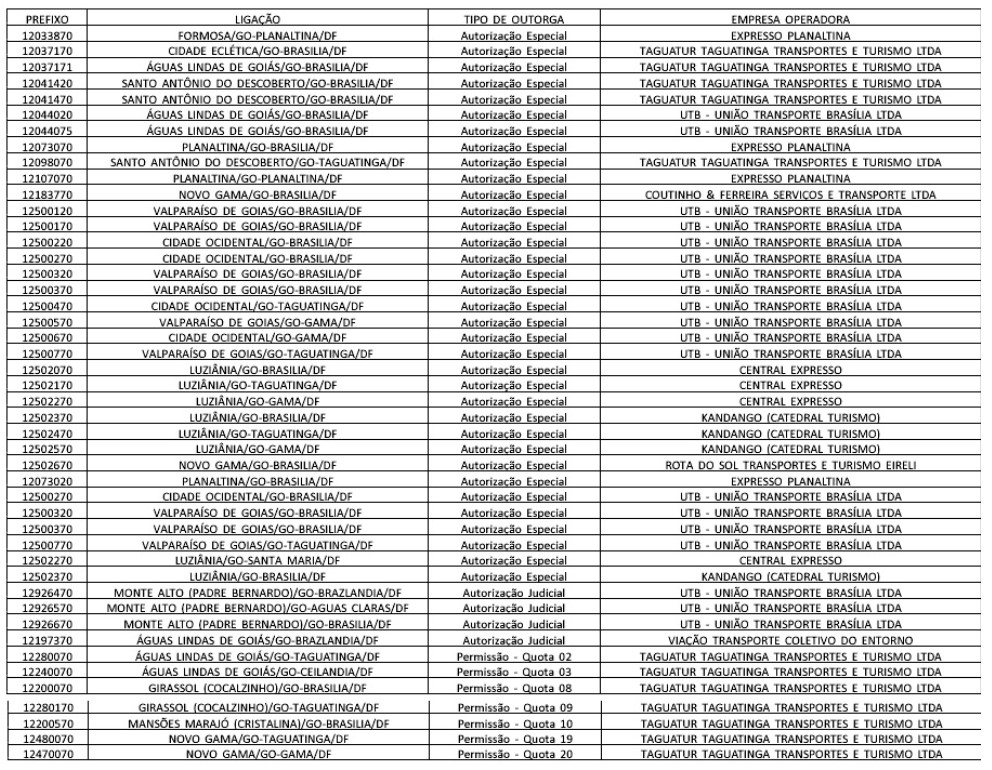 Relação de prefixos de linhas semiurbanas transferidos para o GDF