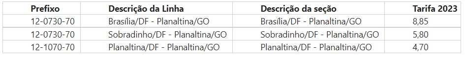 Histórico - As tarifas do transporte rodoviário semiurbano de passageiros entre DF/GO estavam sem atualização há dois anos. A recomposição tarifária é um direito das empresas, que precisa ocorrer anualmente para manter o equilíbrio econômico-financeiro do contrato e a operação. Diante disso, foi preciso recompor o aumento nos componentes dos índices de reajustes, como combustível, que chegou a 48,281%; óleo lubrificante, que atingiu 49,958%; pneus, que subiu mais de 100% só em 2021; IPCA acumulado, que 16,43% em dois anos; entre outros. O reajuste, que recompõe somente uma parte do desequilíbrio da tarifa, volta a entrar em vigor no caso de Planaltina (GO). As demais localidades do entorno já estavam com a nova tarifa em vigor desde março de 2023.