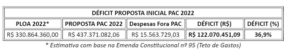 Assim, verificou-se que a primeira minuta do PAC 2022 não estava compatível com a realidade orçamentária da Agência, com déficit de 36,9%.