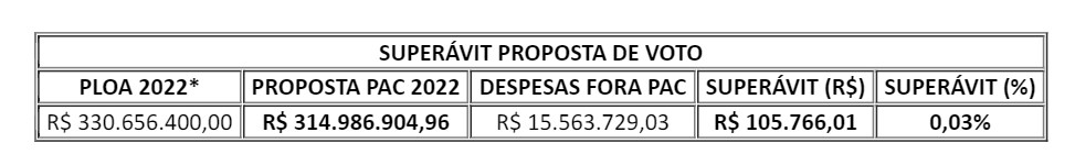 Diante do momento de restrição orçamentária e considerando que o orçamento de 2021 já está aprovado, a Diretoria-Geral propôs um novo quadro, após os referidos ajustes, o que resultou em um superávit de R$105.766,01 (0,3%).