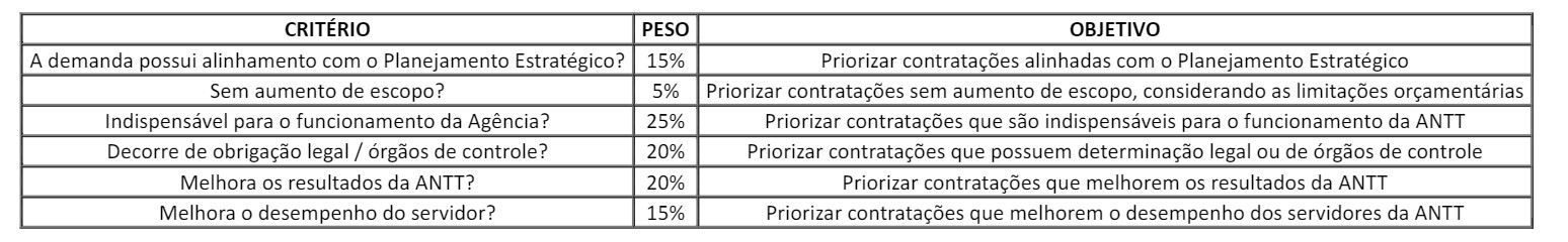 O comitê responsável na Agência começou a buscar soluções e ajustes, a partir da reavaliação crítica das demandas de contratações propostas, em razão do cenário restritivo. Para fins de priorização dos projetos, foram adotados os seguintes critérios: