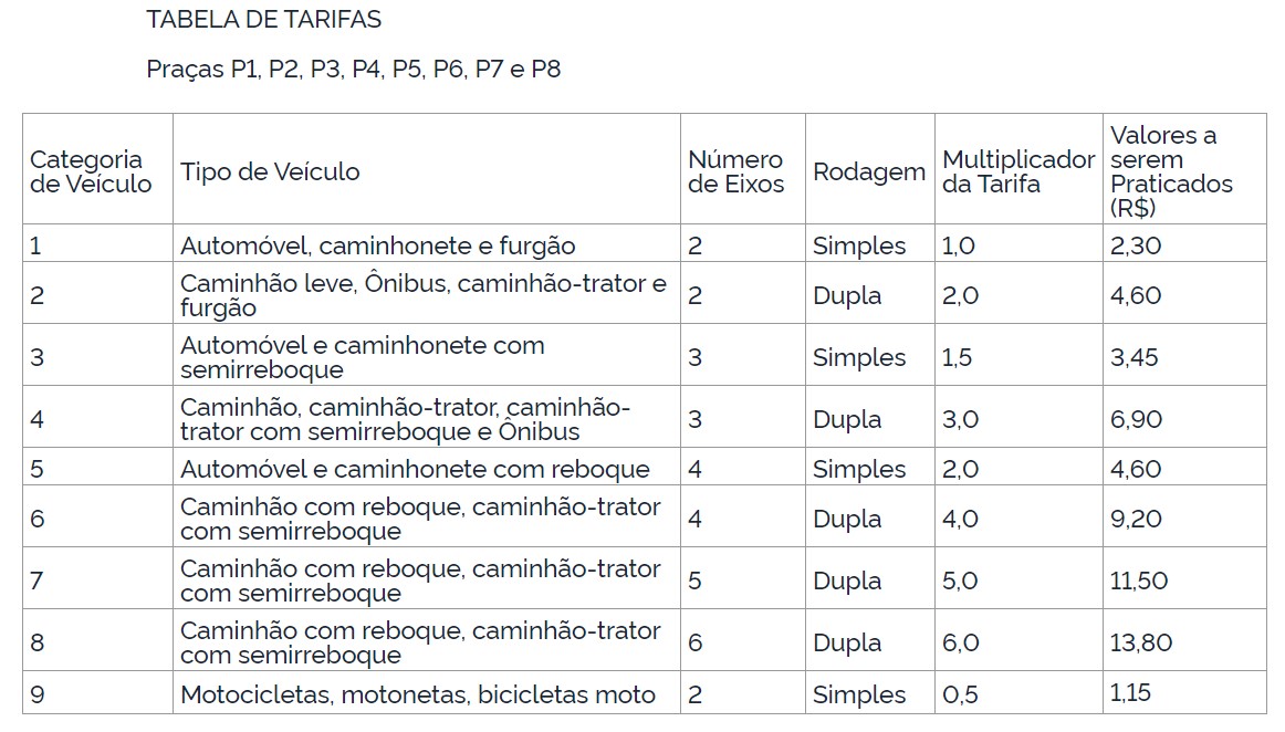 Dessa forma, a Diretoria da ANTT decidiu manter a Tarifa Básica de Pedágio reajustada, após arredondamento, de R$ 2,30 (dois reais e trinta centavos), nas praças de pedágio P1, em Mairiporã/SP, P2, em Vargem/SP, P3, em Cambuí/MG, P4, em Careaçu/MG, P5, em Carmo da Cachoeira/MG, P6, em Santo Antônio do Amparo/MG, P7, em Carmópolis de Minas/MG, e P8, em Itatiaiuçu/MG, para categoria 1 de veículos. Veja a tabela abaixo: