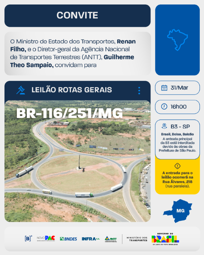 OBJETO: CONCESSÃO DE SERVIÇO PÚBLICO PRECEDIDA DA EXECUÇÃO DE OBRA PÚBLICA, compreendendo a exploração da infraestrutura e da prestação dos serviços de recuperação, manutenção, conservação, operação, monitoração, implantação de melhorias, manutenção do nível de serviço e ampliação de capacidade da BR-251/MG, trecho com início no entroncamento com a BR-116 (B) até o entroncamento com a BR-122 (B) (Início do perímetro urbano de Montes Claros); BR-116/MG, trecho com início na Divisa BA/MG até o entroncamento BR-381/451 (B) (Viaduto Contorno de Governador Valadares, com uma extensão total de 734,900 km.