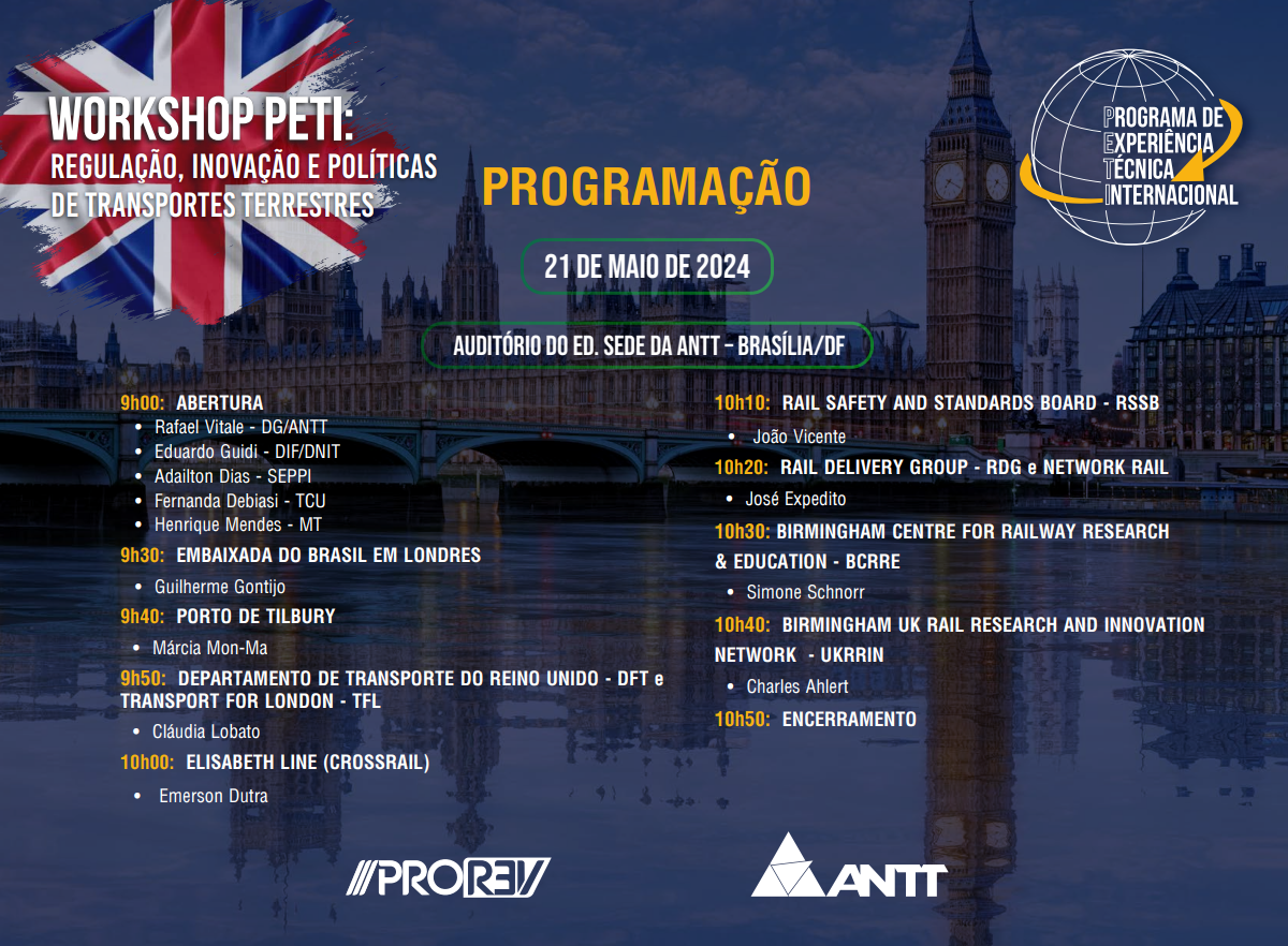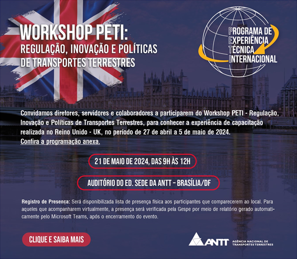A ANTT vai promover, no dia 21/5, a partir das 9h, o Workshop PETI Reino Unido, com o objetivo de compartilhar as experiências adquiridas com a primeira missão do Programa de Experiência Técnica Internacional (PETI) 2024. O evento vai ser realizado de forma híbrida (presencial e online), no auditório do edifício-sede da Agência, e transmitido pelo Microsoft Teams.