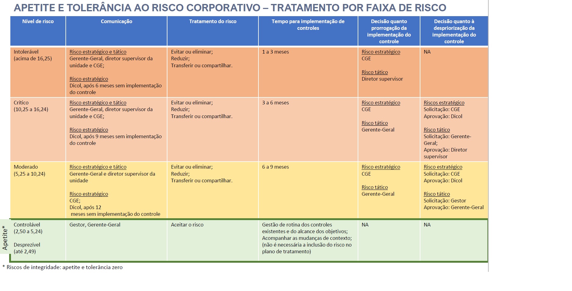 Apetite ao risco: a Anvisa está disposta a aceitar os riscos corporativos nos níveis “controlável” e “desprezível”, não necessitando, portanto, execução de novos controles para reduzir estes riscos. A exceção são os riscos de integridade, que possuem apetite e tolerância zero, ou seja, independentemente do nível em que se encontra, devem ser adotadas medidas adicionais para tratamento do risco.