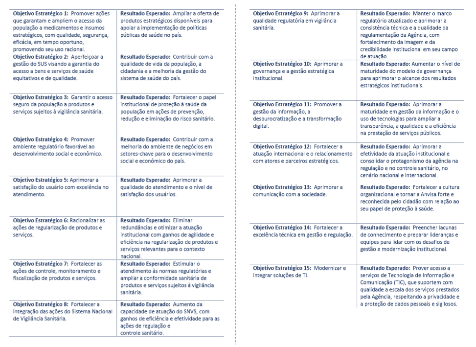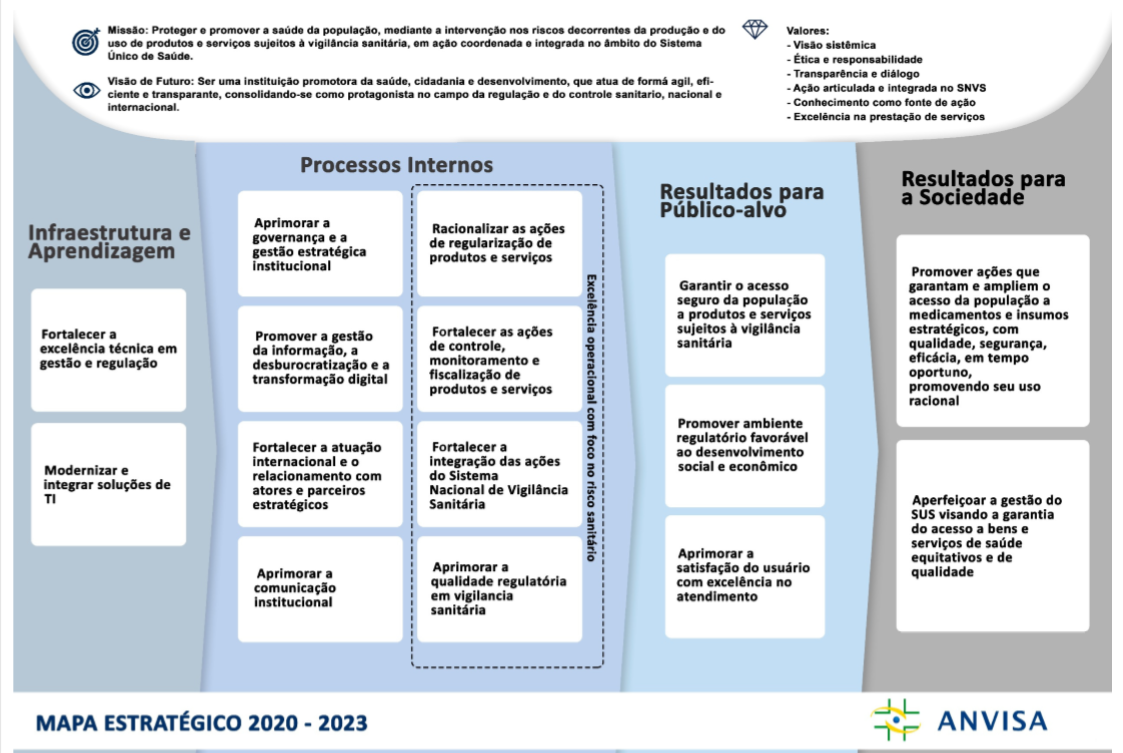 O Mapa Estratégico tem por objetivo traduzir de forma simples e visual como a missão da Anvisa será cumprida e a visão de futuro alcançada. O mapa deve direcionar o comportamento e o desempenho institucional de modo claro e transparente a todos os níveis gerenciais, servidores e à sociedade quanto ao foco e à estratégia de atuação escolhidos pela Anvisa, além de subsidiar a alocação de esforços da organização, evitando a dispersão de ações e recursos. Ele é composto pelas declarações estratégicas de missão, visão e valores, bem como por um conjunto de 15 (quinze) objetivos estratégicos organizados em 4 (quatro) dimensões: