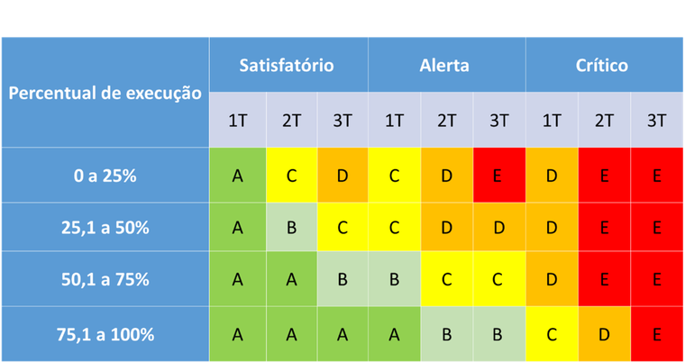 Com o objetivo de obter uma visão sintetizada das informações de monitoramento da estratégia, a Anvisa criou, em 2021, o índice de “categoria de desempenho” para comunicar e identificar situações de risco em relação ao alcance dos resultados de forma mais objetiva, precisa e preditiva, a partir dos sinais de comportamento das metas obtidos por meio da classificação em um dos cinco níveis de categoria de desempenho (A, B, C, D ou E), conforme ilustra a figura a seguir: