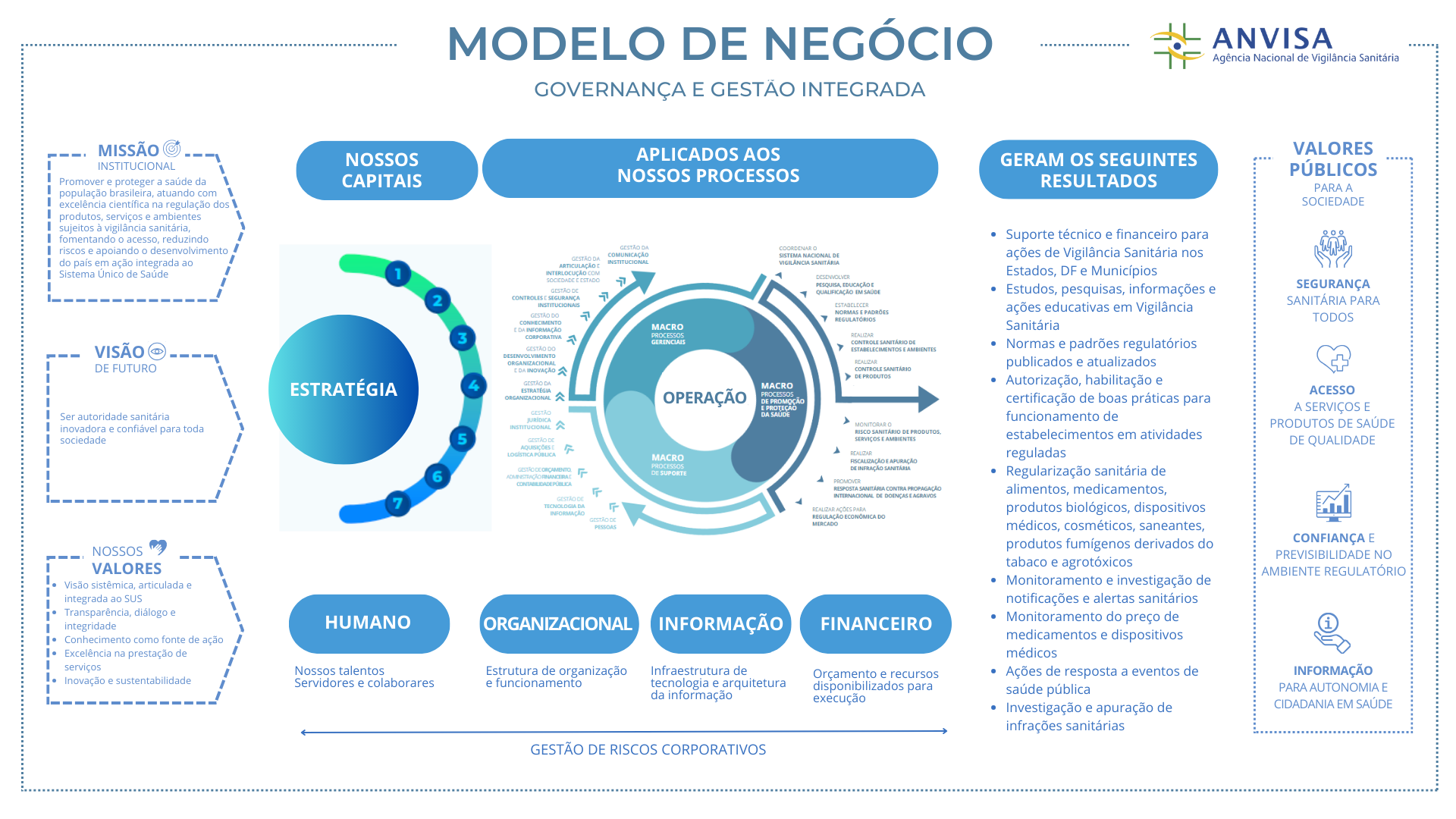 O modelo de negócio é uma representação visual que expressa, de forma integrada, a lógica de transformação dos principais recursos da organização em produtos e serviços que geram valor para a sociedade. O modelo de negócio da Anvisa está centrado na geração de valor público e contempla uma visão integrada de governança e gestão, que alinha estratégia e operação da cadeia de valor para direcionar e realizar ações voltadas à promoção e proteção da saúde da população, no contexto do Sistema Nacional de Vigilância Sanitária (SNVS). Para o desenvolvimento de nossas atividades e entregas, contamos com uma estratégia de médio e longo prazo e utilizamos nosso capital humano, organizacional, tecnológico, informacional e financeiro aplicado a processos, para desempenhar nossa função regulatória e gerar respostas efetivas e úteis às necessidades e demandas de interesse da sociedade.