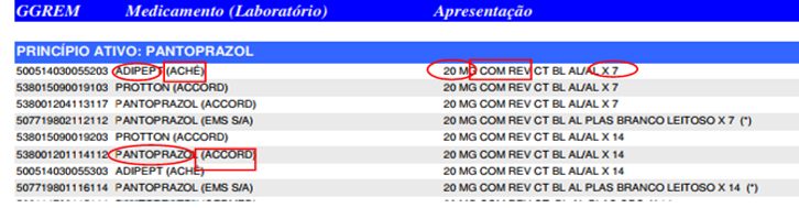 Lembrando que genéricos não têm nome de marca, então o nome do medicamento será o próprio princípio ativo. Na coluna à direita – Apresentação - está a concentração (20 mg, 30 mg/ml, etc.), a forma farmacêutica (comprimido, xarope, etc.) e a quantidade de unidades farmacotécnicas: o número de comprimidos ou de ampolas por exemplo.