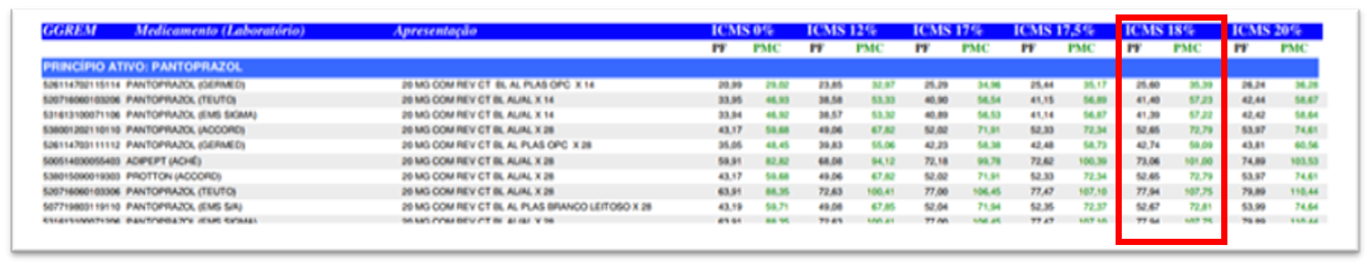 Os Preços Fábrica (PF), nas diferentes alíquotas de ICMS, podem ser calculados por meio dos fatores de conversão divulgados pela Câmara de Regulação do Mercado de Medicamentes. Já os Preços Máximos ao Consumidor (PMC) são calculados pela divisão do PF pelo fator de conversão correspondente à alíquota de ICMS e à LCCT (Positiva, Negativa ou Neutra).