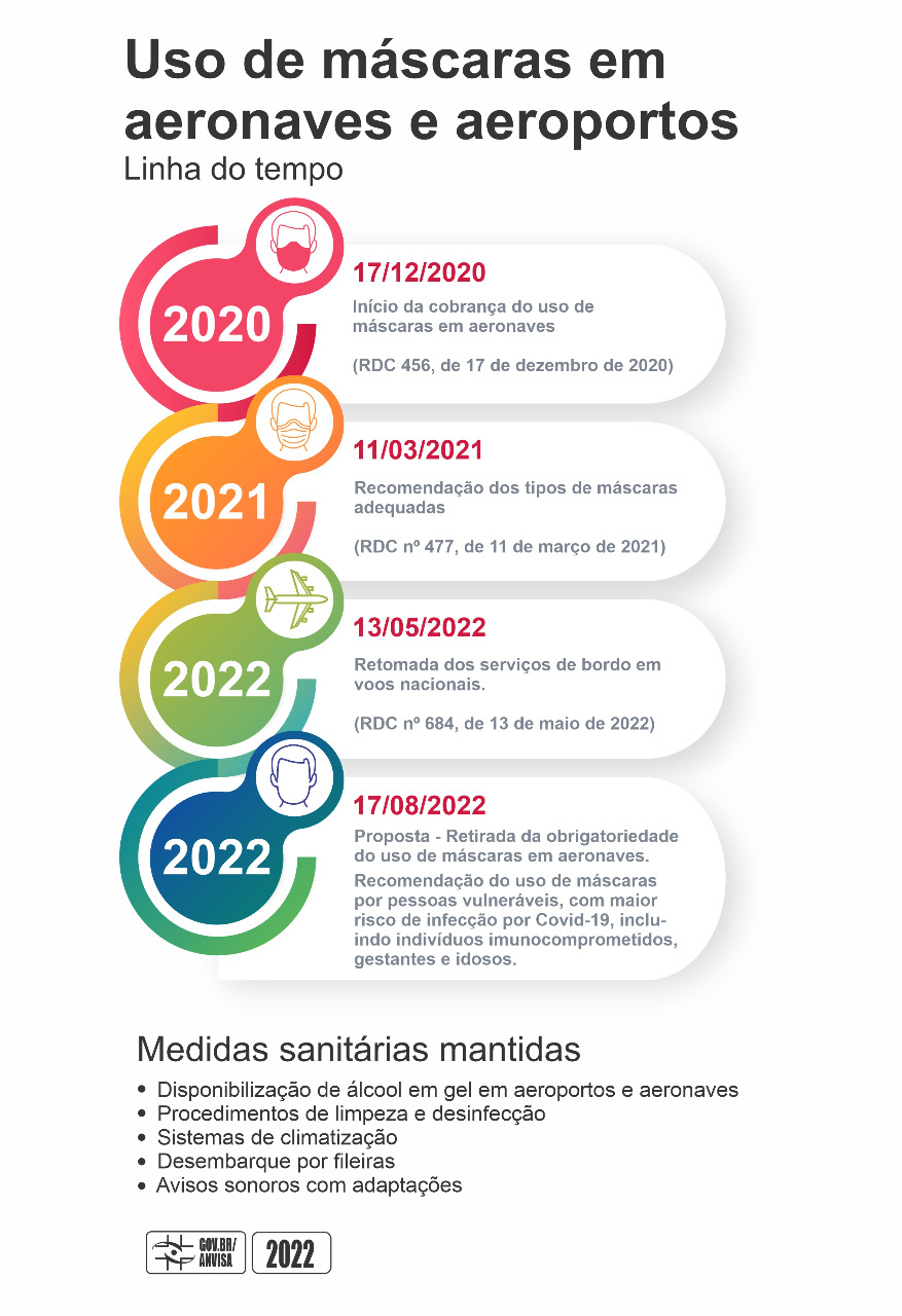 Já em maio de 2022, ainda em vista do cenário epidemiológico, a Anvisa se manifestou sobre a alteração da RDC 456/2020, para que fosse mantido o uso de máscaras faciais de proteção no interior das aeronaves e em áreas restritas dos aeroportos. Contudo, considerando-se o avanço da imunização no país e os dados de hospitalização, foi possível a flexibilização de outras medidas por meio da RDC 684/2022, como a retomada do serviço de bordo, a retirada da obrigatoriedade do distanciamento, que permaneceu como recomendação, e a possibilidade de execução do procedimento de limpeza e desinfecção durante o embarque e o desembarque.