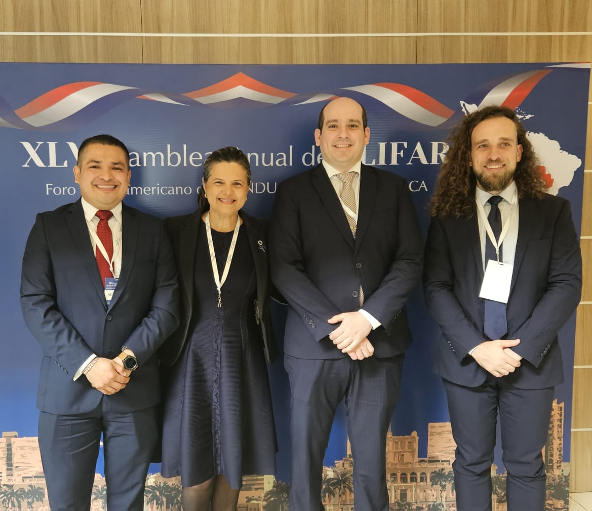 Na foto, estão presentes os representantes das Autoridades Reguladoras que participaram do painel "A importância do reconhecimento e fortalecimento das Autoridades Sanitárias para o desenvolvimento da indústria Farmacêutica. Da esquerda para a direita, estão o Diretor da Direção Nacional de Medicamenros de El Salvador, Noé Giovani Garcia, a Diretora da Anvisa, Meiruse Sousa Freitas, o Diretor da Direção Nacional de Vigilância Sanitária do Paraguai, Jorge Iliou Silvero, e o representante da Assessoria de Assuntos Internacionais da Anvisa, Felipe Dias.