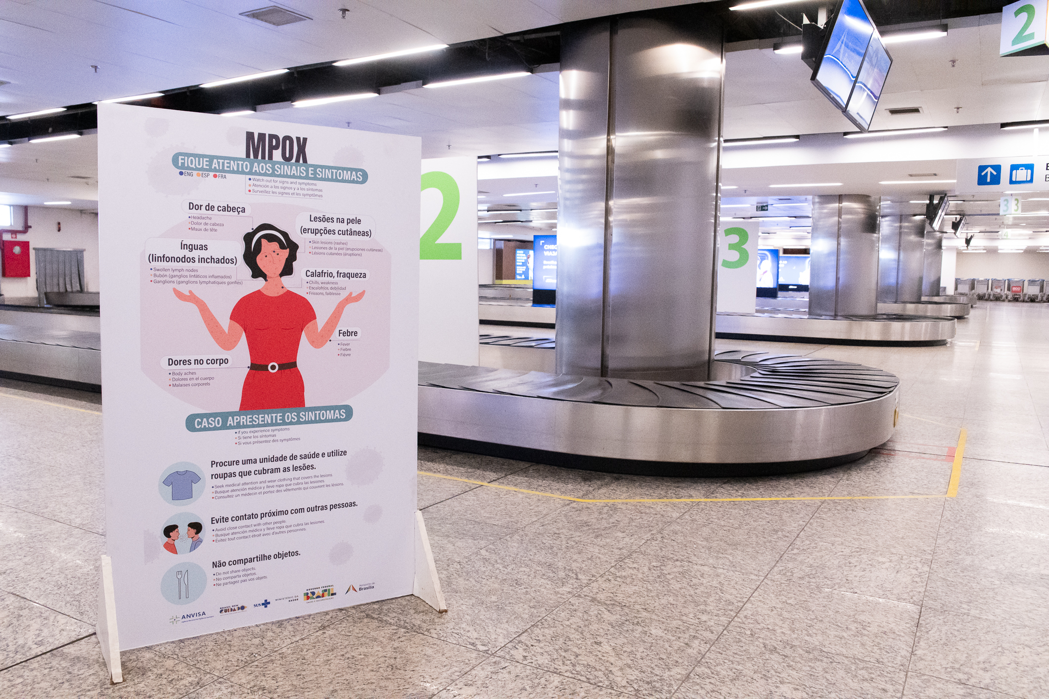 Banner na área de desembarque internacional do aeroporto de Brasília.