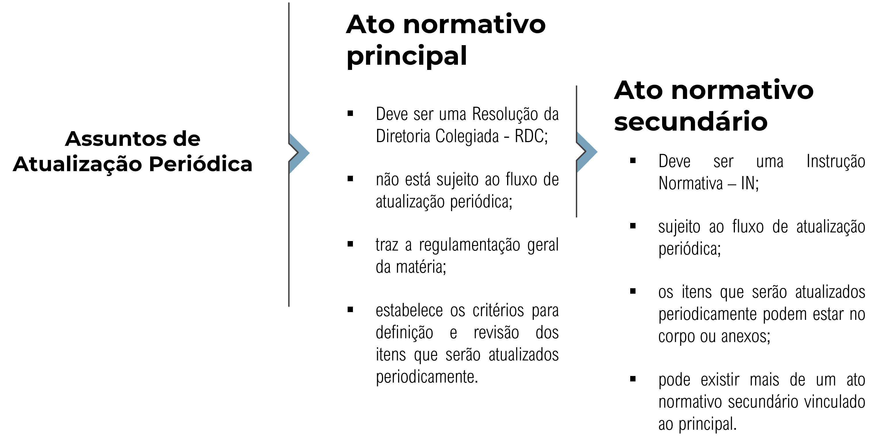 Atualmente, esse fluxo é disciplinado em ato normativo interno da Anvisa, a Orientação de Serviço nº 117, de 12 de dezembro de 2022, que dispõe sobre o fluxo regulatório e os procedimentos para os assuntos de atualização periódica.