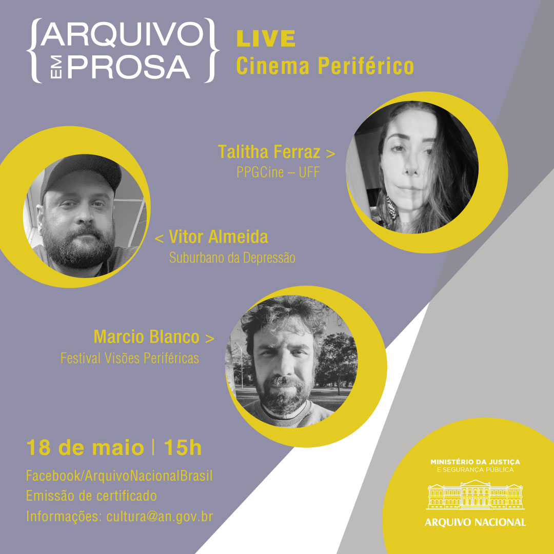 O Arquivo em Prosa: Cinema Periférico será transmitido ao vivo na página do Arquivo Nacional no Facebook , não sendo necessário realizar inscrição prévia. Para receber o certificado de participação, ao final da live , disponibilizaremos um formulário para cadastro de presença e encaminharemos o certificado para o e-mail registrado. O público poderá participar por meio de perguntas e outras interações nos comentários da transmissão.