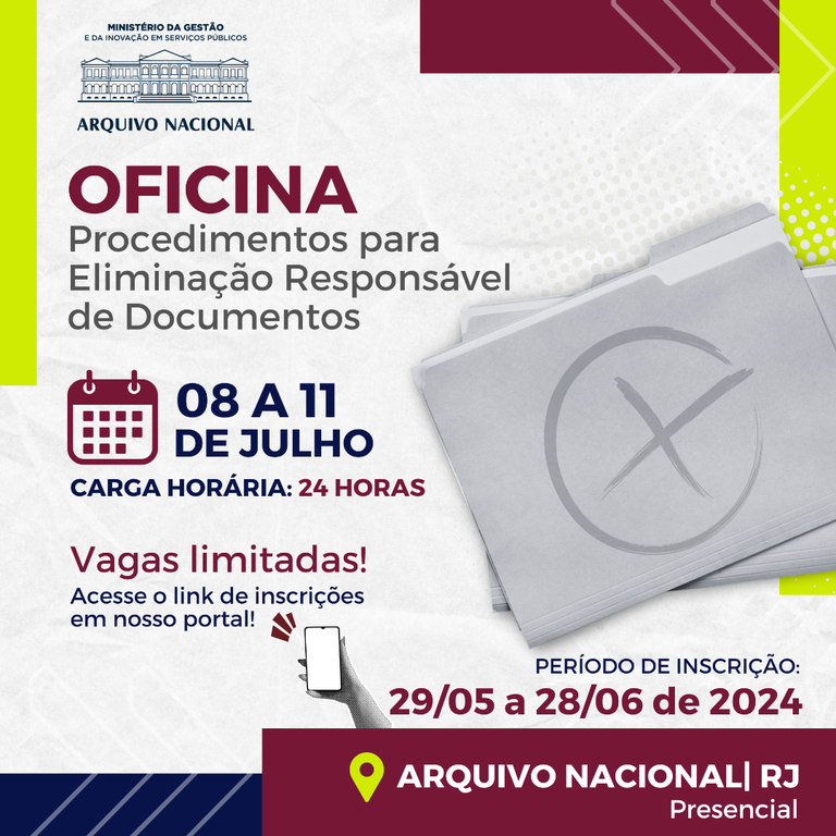 A Divisão de Capacitação, da Coordenação-Geral de Gestão de Documentos (Coged/DGD) está com inscrições abertas para a primeira turma da Oficina de Procedimentos para Eliminação Responsável de Documentos. A oficina ocorrerá de 8 a 11 de julho, com carga horária de 24 horas.