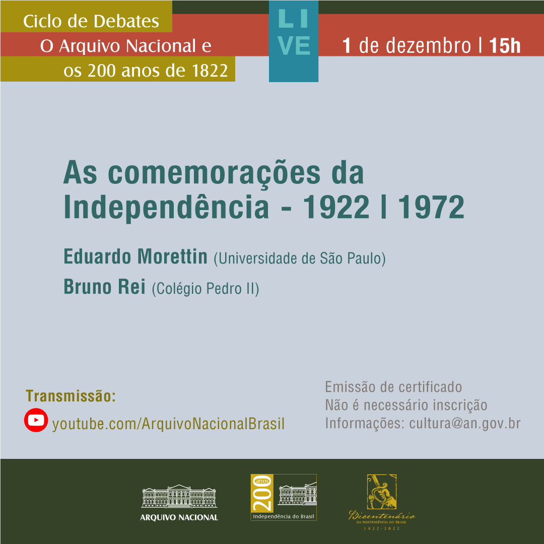 O debate faz parte das comemorações do bicentenário da Independência do Brasil, e tem como objetivo discutir as comemorações oficiais da Independência ocorridas nos anos de 1922 e 1972 , referenciando acervos custodiados pelo Arquivo Nacional, em especial o da Comissão Executiva da Comemoração do Centenário da Independência , e o da Comissão Executiva Central do Sesquicentenário da Independência do Brasil . A mesa contará com a participação de Bruno Rei e Eduardo Morettin.