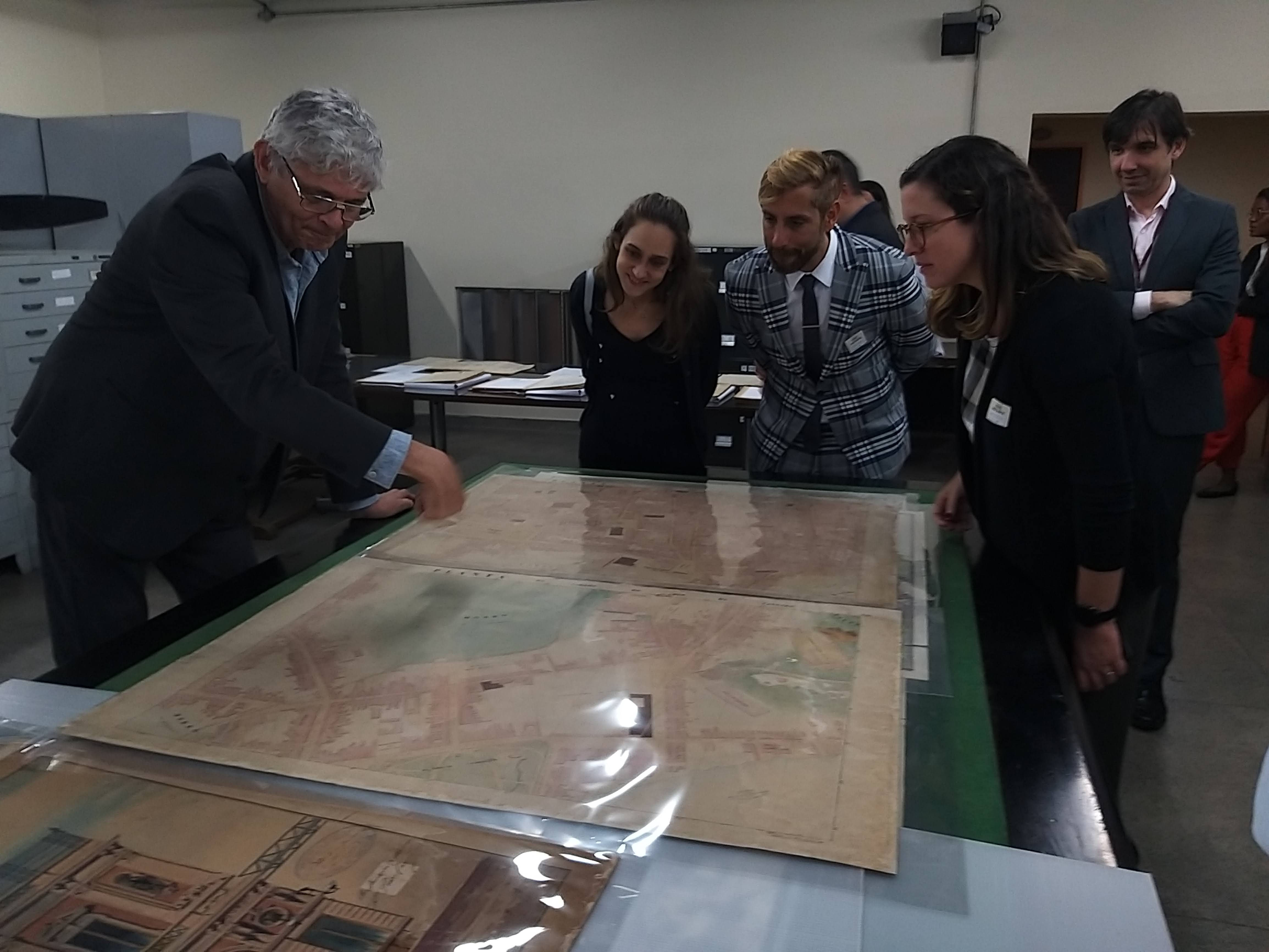Além de visitarem o belo conjunto arquitetônico da sede e os depósitos com controle de temperatura e umidade, os técnicos tiveram contato com o setor de atendimento ao usuário e com fotografias e mapas do nosso acervo, sob a orientação de servidores especializados nesses tipos de documentos.